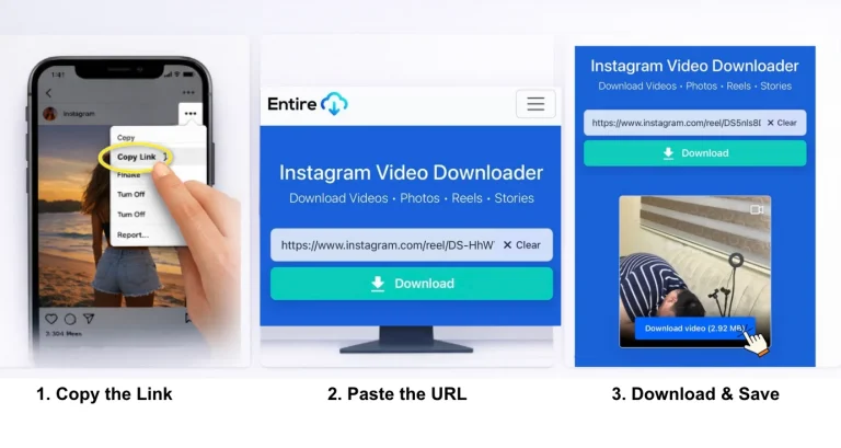 There are three steps to follow when you want to use entire downloader. First, copy the video or photo link from Instagram by tapping the three dots. Next, paste the URL into our download box and click the download button. Then, choose your preferred quality and save the content directly to your phone, tablet, or computer.